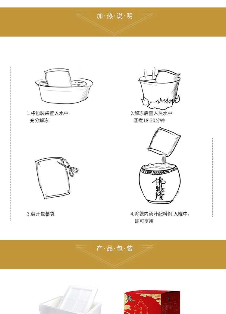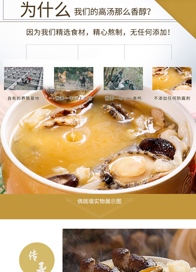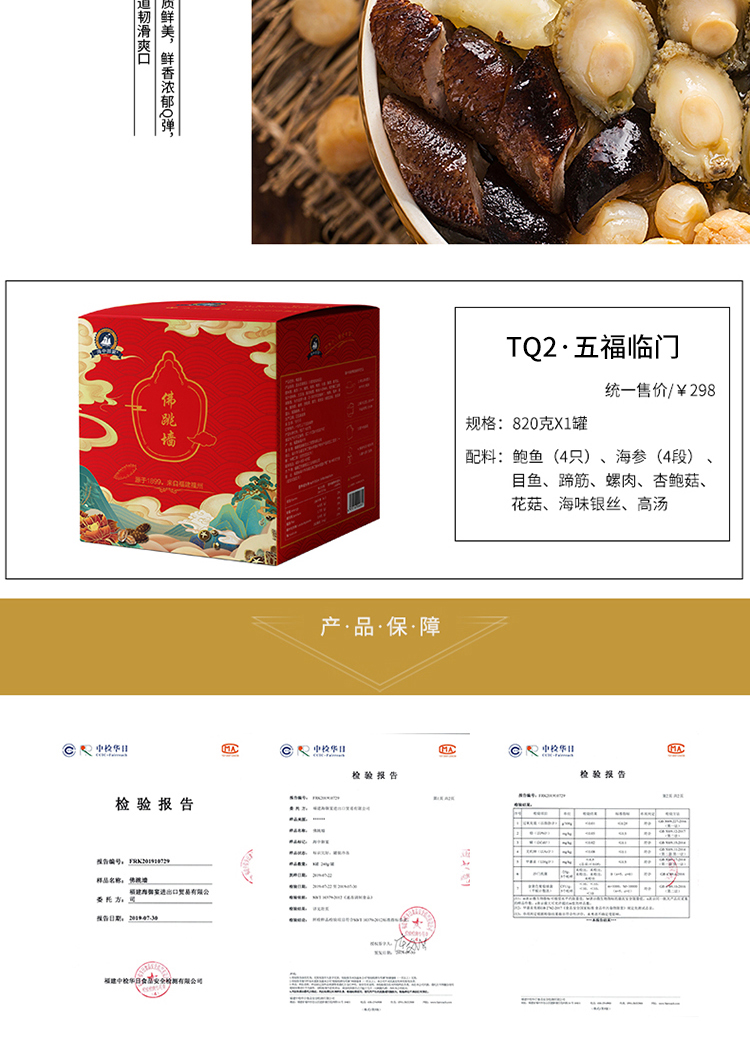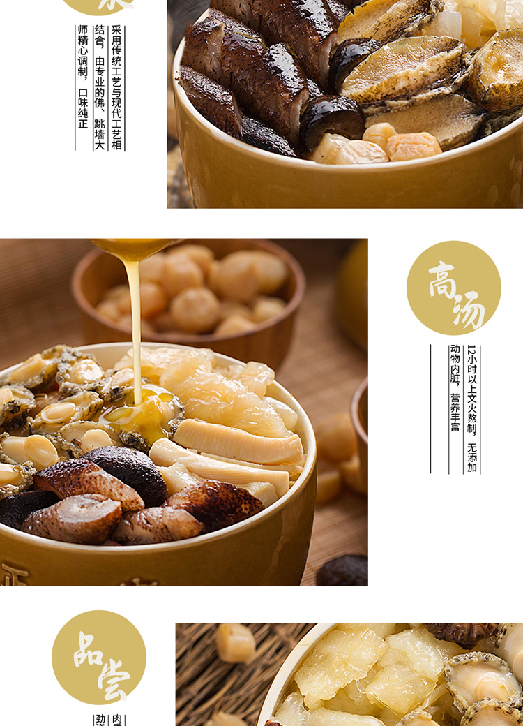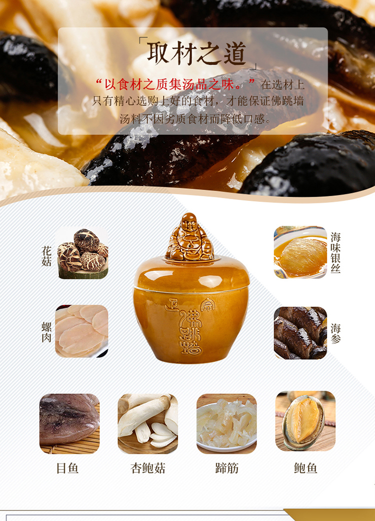 海参(4片)、鲍鱼(4只)、瑶柱、目鱼、蹄筋、杏鲍菇、花菇、螺肉、海味银丝、高汤(精品)