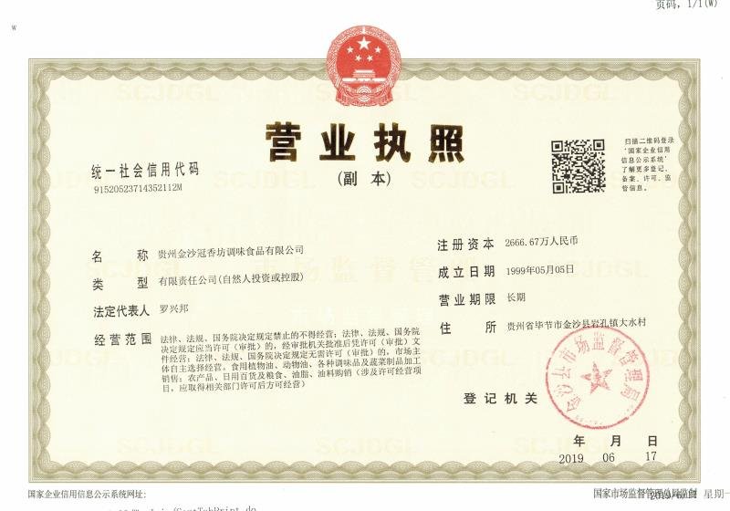 贵州金沙冠香坊调味食品有限公司是贵州省农业产业化经营重点龙头企业、贵州省级诚信私营企业、贵州省重点扶贫龙头企业,旗下品牌“冠香源”是贵州省著名商标,“冠香源”牌产品是贵州省名牌产品。是一家有20年研究贵州特色食品的民营企业。 公司建立二十余年来,依托贵州特色食材,秉承苗家酸汤传统工艺,集苗家酸汤之大成,创新酸汤配制技术,秉持匠人匠心精神,致力打造中国“三酸”系列产品——黄酸汤、白酸汤、红酸汤,致力将“冠香源”牌酸汤打造成中华第一汤,贵州冠香源,酸汤行天下!